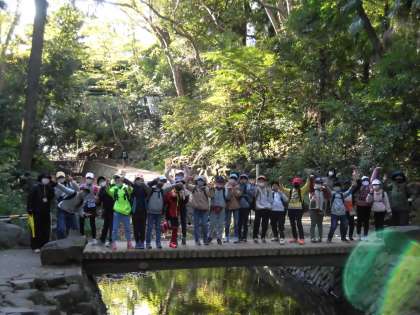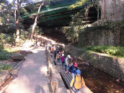今までに等々力渓谷に行ったことがある児童もいましたが、1学期に九品仏の町を実際に歩いて学んだ子どもたちは、都会の中で、急に現れる等々力渓谷に改めて驚いていました。