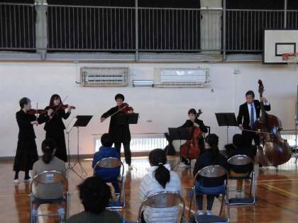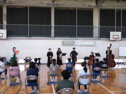 本日の2、3時間目に体育館で、東京フィルハーモニー交響楽団の方による音楽鑑賞教室を行いました。例年5年生は、人見記念講堂のホールでオーケストラの演奏を聴きますが、今年度は形を変えて、各学校での演奏となりました。