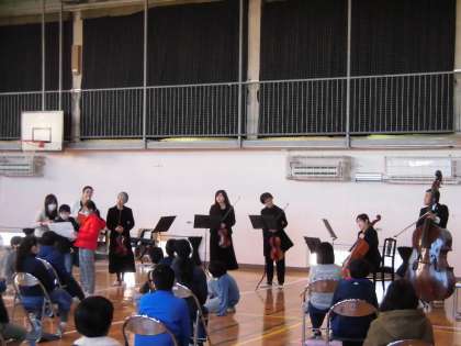 演奏してくださった曲はどれも有名なオーケストラの曲で、その美しい音色に耳を澄ませていました。各国の有名な作曲家による音楽に加え、本校の校歌を特別に編曲し、演奏してくださいました。ピアノの伴奏とは違った厚みのあるハーモニーに、子どもたちは笑顔を浮かべ、口ずさみながら聞いていました。また、九品仏小学校のために校歌を録音したCDまでプレゼントしてくださり、お昼の放送で全校の皆さんにも聴いてもらいました。