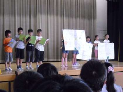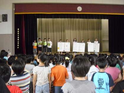今朝の児童会は、“4年生のエコ隊”の九品仏小の取組みと各家庭でできること発表と夏休みの取組みのお願いがありました。