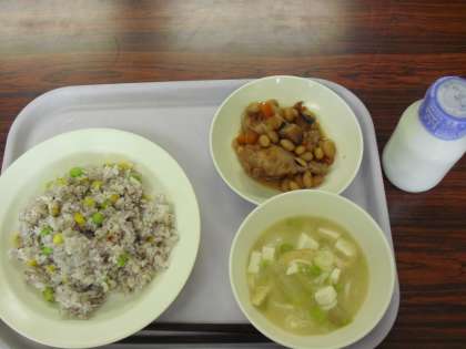 今日の献立は、夏の香りご飯、牛乳、冬瓜のみそ汁、大豆と手羽のやわらか煮です。