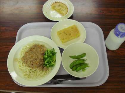 今日の献立は、ジャージャー麺、牛乳、枝豆、パンケーキです。