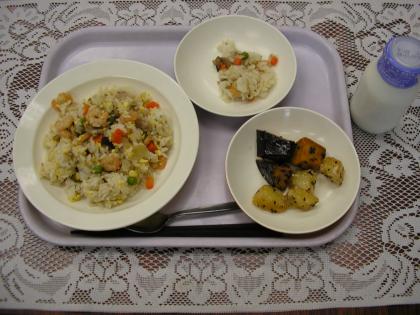 今日のメニューは、チャーハン、牛乳、リンゴ入り大学いもです。今日もアレルギー食を調理員さんがおいしく作ってくれました。