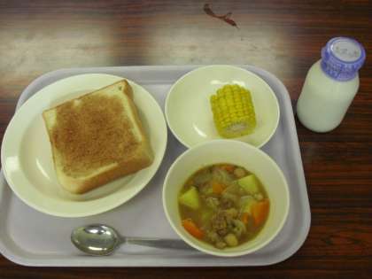 今日の献立は、シナモントースト、牛乳、ひよこ豆のカレースープ、トウモロコシです。