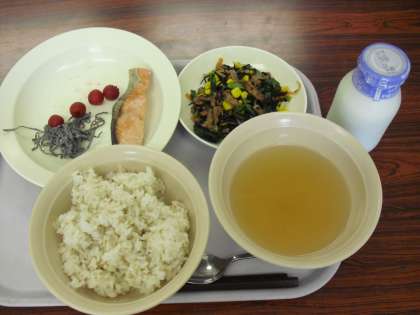 今日の献立は、冷やし茶づけ、牛乳、焼き魚、バランスサラダです。