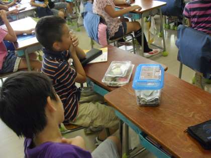 朝の会の先生の話・・・飼育の観察もしていました。