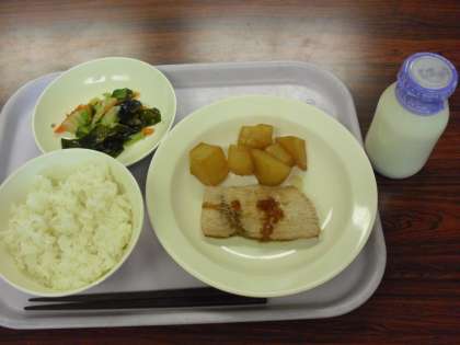 今日の献立は、ご飯、牛乳、魚の生姜風味焼き、じゃが芋の甘辛煮、わかめサラダです。