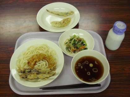 今日の献立は、冷やしつけ面、牛乳、天ぷら“南瓜、ししゃも”、野菜のごまだれかけでうs。アレルギー対応食を調理員さんが作りました。