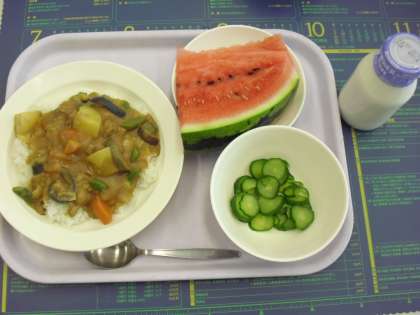 今日の献立は、夏野菜のカレーライス、牛乳、きゅうりのひと塩、くだものです。