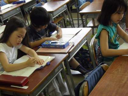 いつものように各自が連絡帳に予定を書きます。そして、リーダーが前にでて、音読・・で一日がスタートします。1年生も集団の中で育っています。クラスの友達とのふれあい、6年生のお世話や縦割り活動などによって、異学年との“絆”もできつつあります。