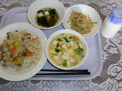 今日のメニューは、ふきよせごはん、牛乳、かき玉汁、ごま酢かけです。今日も調理員さんがアレルギー対応食をつくってくれました。