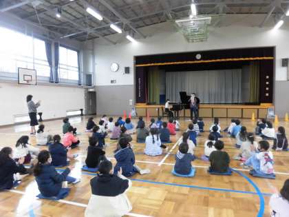 普段見慣れないユーフォ二アムの説明では、管の長さが3mであることや、6kgの重さがあることに驚いていました。演奏していただいた曲は、映画やCMで耳にする馴染みのある曲で、子どもたちは自然と体を揺らしたり、手拍子をしたりして音楽を楽しみました。