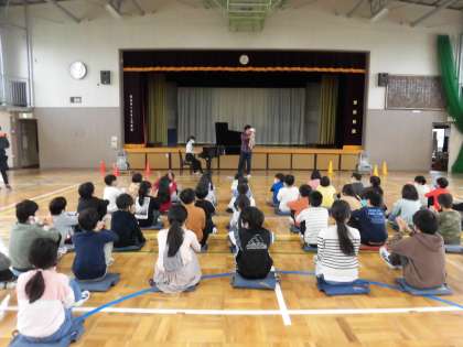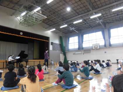 東京都小金井市観光大使であるエバリーさんより、お二方が来校し、ミニコンサートを開いていただきました。