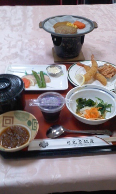 今日は、華厳の滝見学・・・戦場ヶ原ハイキング・・・遊覧船乗船などの疲れを温泉でとり・・・夕食です。
