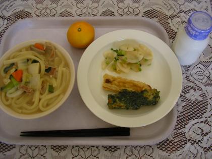 今日のメニューは、みそ煮こみうどん、牛乳、天ぷら、かぶのレモンしょうゆかけ、