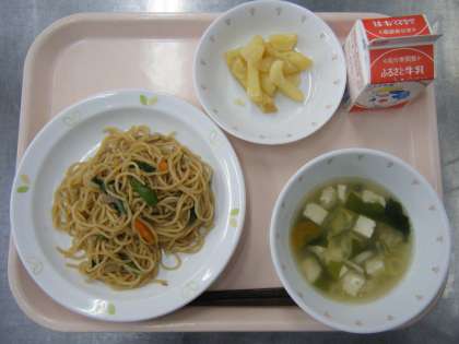 今日の給食は、塩焼きそば・牛乳・フライドポテト・わかめスープです。