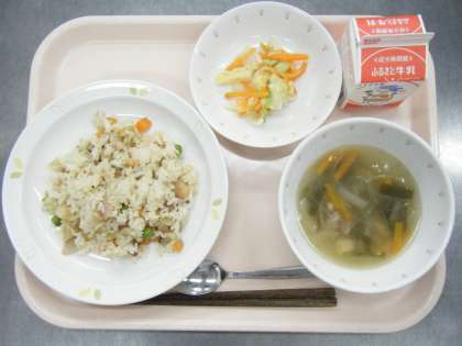 今日の給食は、チャーハン・牛乳・辣白菜・茎わかめの中華風スープです。