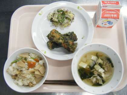 今日の給食は、たけのこごはん・牛乳・ちくわの磯辺あげ・豆腐汁・野菜のゆかりかけです。