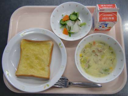 今日の給食は、ガーリックトースト・牛乳・チャウダー・野菜のレモンかけです。