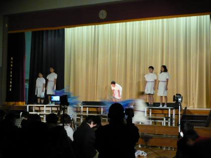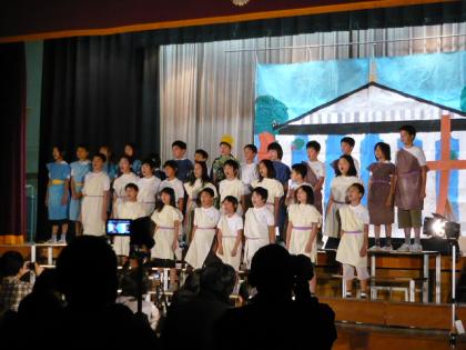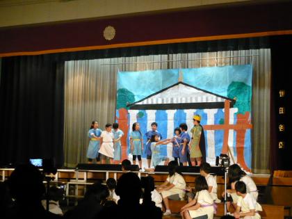舞台上で演技するメロス役や王役の子どもたちを始め、舞台下のコール隊の子どもたちも、みんなが心を合わせて、メロスとセリヌンティウスとの友情劇を演じました。観客に呼びかけるような仕草や話し方は、さすがの高学年でした。