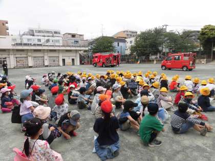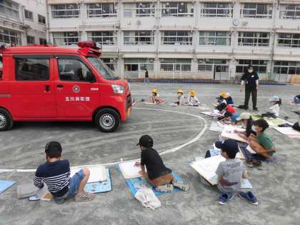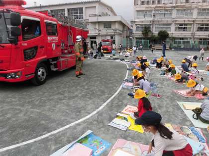 大きくてかっこいい消防車を間近かに、どの子もクレパスで大きくのびのびと熱心に描いていました。