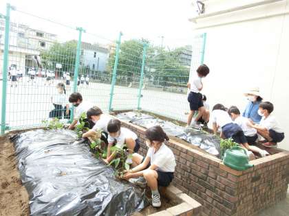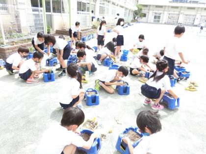 生活科「ぐんぐん育て おいしい野菜」の学習です。グリーンボランティアの方たちの力をお借りしながら、自分たちが選んだ野菜(ナス・ピーマン・キューリ・サツマイモ)を植えました。昨年度、植木鉢に植えていたチューリップの球根も掘り起し、興味深そうに見ていました。
