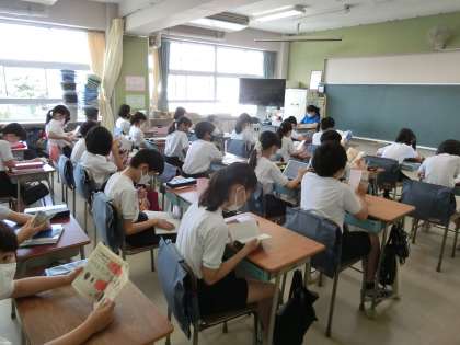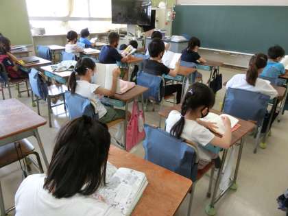 1・3・5年生の朝の読書タイムです。どの学級もリラックスして、静かに本を読んでいます。2・4・6年生は校庭で縄跳びタイムです。