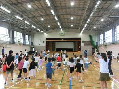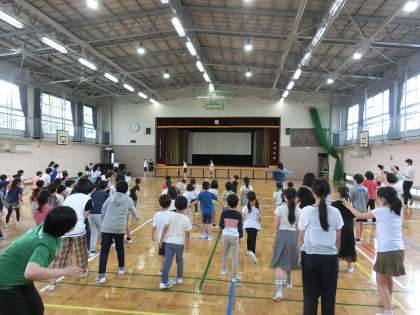 集会委員が中心となって、昼休みに、体育館で1年生と6年生で「だるまさんが転んだ」をして遊びました。最初は、集会委員が鬼をしてくれましたが、タッチされるとかわっていきます。全校がそろって児童集会はできませんので、2学年で行っています。