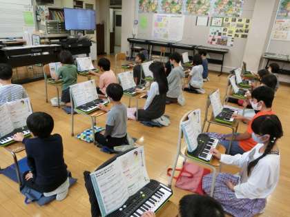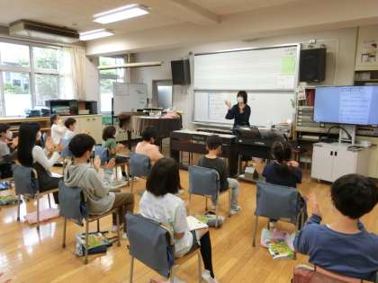 「歌声のひびきを感じ取ろう」の学習です。曲♪いいことありそう♪の楽譜を見ながら、曲の感じに合った歌い方や鍵盤のひき方をみんなで考えました。楽しそうに拍を感じながら、電子キーボードで演奏しました。