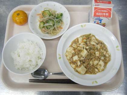 今日の給食は、麦ごはん・牛乳・麻婆豆腐・春雨サラダ・くだもの(冷凍みかん)です。