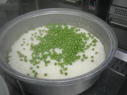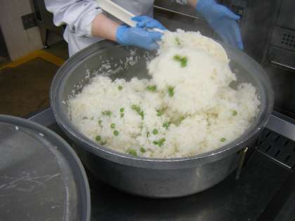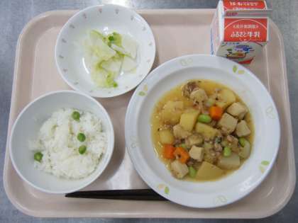 今日の給食は、グリンピースごはん・牛乳・新じゃがのそぼろ煮・大根ときゃべつの甘酢かけです。