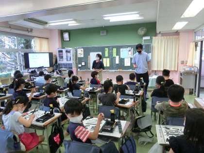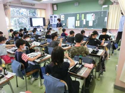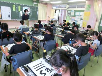 昨日の1組に引き続き、今日は2組が3年生になって初めての書写の学習です。用具の準備や片付けの仕方、書くときの姿勢や筆の持ち方、腕の使い方などを学習し、実際に縦や横、曲線を書いてみました。教室は、墨の良い香りがします。