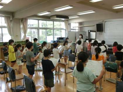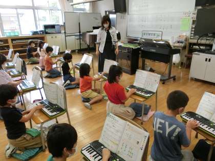 「海風きって」の学習です。曲のアの部分とイの部分の2つの旋律の違いを感じ取って、小さな声ではありますが歌いました。また、ハ長調の曲調を感じ取って、イの旋律を電子キーボードで演奏しました。