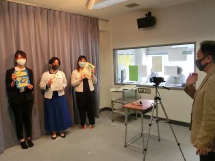 離任式が始まる前に、職員室で教職員と挨拶をかわしました。そして、テレビ放送での離任式を終えた後のワンショットです。