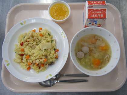 今日の給食は、パエリア・牛乳・レンテハス(レンズ豆のスープ)・オレンジゼリーです。