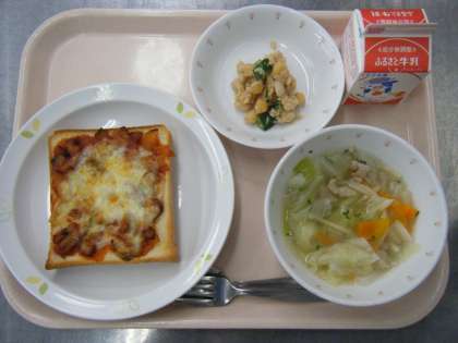 今日の給食は、ピザトースト・牛乳・ヌードルスープ・ビーンズサラダです。