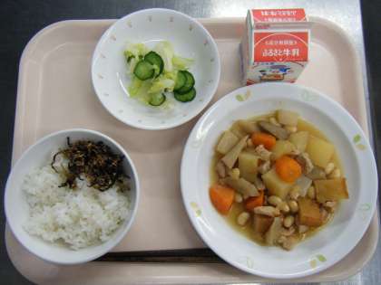 今日の給食は、麦ごはん・牛乳・かみかみ佃煮・豆入り筑前煮・野菜のひとしおです。