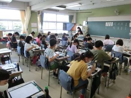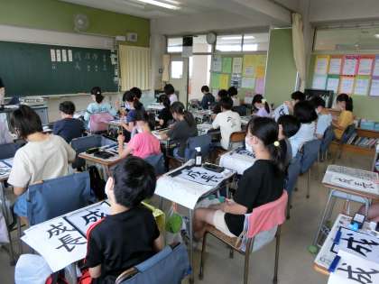 毛筆 「筆順と字形」の学習です。筆順と字形の関係を理解し、穂先の動きと点画のつながりを意識して『成長』を書きました。「払い」や「はね」も一生懸命書きました。