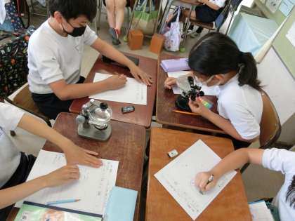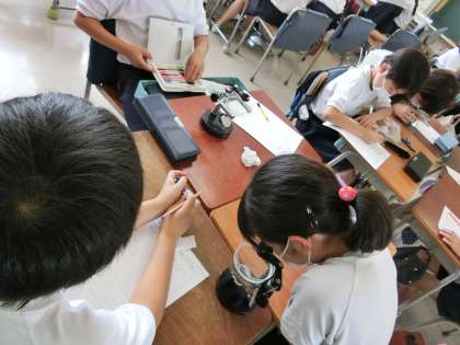 「魚のたんじょう」の学習で、解剖顕微鏡を使用してメダカの受精卵の観察をしました。