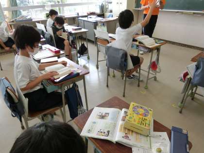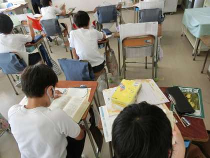 プール前健診と並行して、国語「時計の時間と心の時間」学習です。国語辞典を活用して、文章内に出てくる難しい言葉について調べました。
