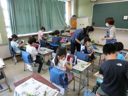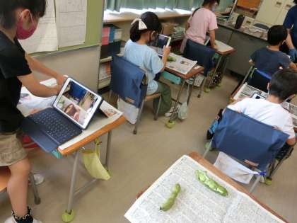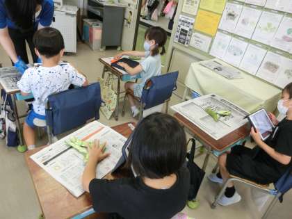 そら豆のさやをむいた後も見られるように、タブレットで写真を撮りました。栄養士さんや小1サポーターの方にも、手伝っていただきました。