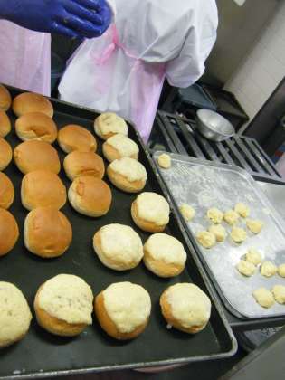 今日のメロンパンは、調理員さん達が一生懸命ビスケット生地をこねて成形し、作ってくれました。皆さん、「おいしい!」とたくさん食べてくれていて、とても嬉しいです。残菜もほとんどありませんでした。