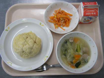 今日の給食は、手作りメロンパン・牛乳・ウィンナーと野菜のスープ煮・人参サラダです。