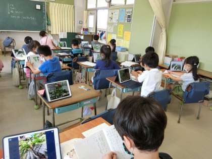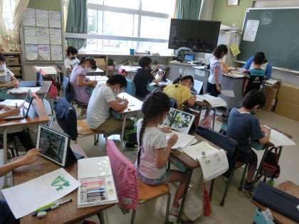 「かんさつ名人になろう」の学習です。観察したことを記録する文章を書く活動です。自分が観察する夏野菜をタブレットで写真に撮り、拡大してよく見ました。「○○が、〜である。」という、文の基本形を押さえて書きました。