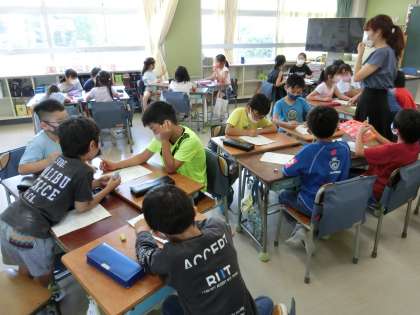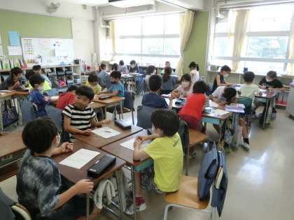 「九品仏の町を知ろう『商店調べ』」の学習です。自分が訪問するお店が決まったので、働く人たちの思いや、お店の工夫について予想しワークシートに書きました。考えた予想を確かめるために、グループごとにどんな質問をしたらよいか考えました。