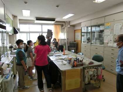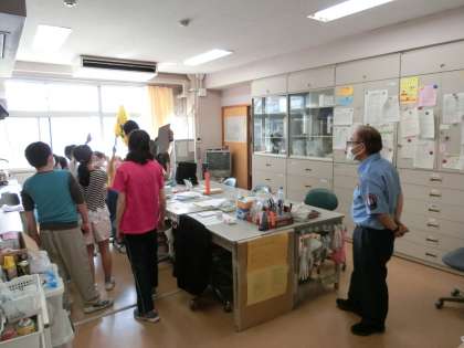 これは「主事室」Q—横断旗の重さを当てようです。普段入ったことのない部屋に入り、興味津々です。