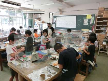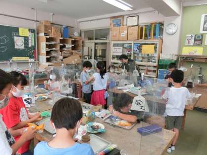 題材名は「カラフルねん土」です。台紙を変形させて、絵の具で色着けした紙粘土を貼り付けながら、皿やペン立てなどを作り始めました。土台ができると、気に入った色の粘土を作るために、絵の具の配合を工夫していました。