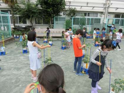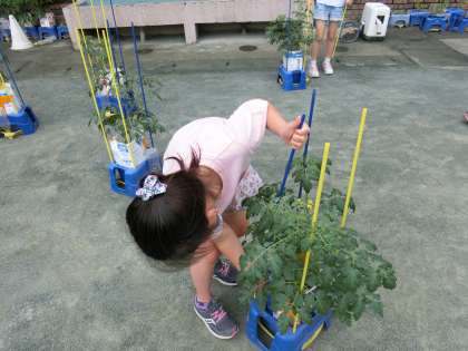 育てている「ミニトマト」が大きくなり、何か支えがあったほうがよいことに気付きました。1年生でアサガオを育てた時の支柱が使えることを思い出し、みんなで一緒に取り付けました。