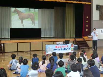 今日の5・6時間目は、「馬!ふれあい出張授業」でした。最初に1・2年生が体育館で、馬の体などについてお話を聞きました。クイズを交えて、馬の体の秘密をたくさん知り、興味が高まっていました。