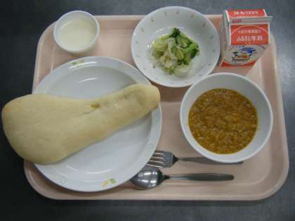 今日の給食は、キーマカレー&ナン・牛乳・グリーンサラダ・ヨーグルトゼリーです。
